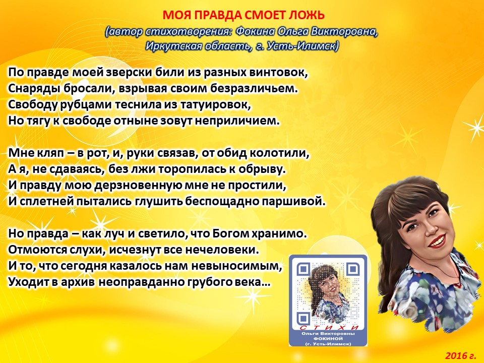 Читает автор стихотворения: ФОКИНА ОЛЬГА ВИКТОРОВНА (Иркутская область, город Усть-Илимск) СТИХИ: https://stihi.ru/2018/07/08/3790 БИОГРАФИЯ: http://www.proza.ru/2019/10/08/1473 ВЫИГРЫВАЙТЕ КНИГИ БЕСПЛАТНО: https://proza.ru/2017/09/17/447 ОТЗЫВЫ ЧИТАТЕЛЕЙ: http://www.proza.ru/2019/11/29/611 Из книги Фокиной Ольги Викторовны (Усть-Илимск) «Несу добро в ладошках!»: [все стихотворения с 2005 по октябрь 2020 гг., проза, авторские песни, интервью]. – Москва: МГО Союза писателей России, 2020 г. – 886 стр., ил. ISBN 978-5-7949-0826-8 МОЯ ПРАВДА СМОЕТ ЛОЖЬ (автор стихотворения: Фокина Ольга Викторовна, Иркутская область, г. Усть-Илимск) По правде моей зверски били из разных винтовок, Снаряды бросали, взрывая своим безразличьем. Свободу рубцами теснила из татуировок, Но тягу к свободе отныне зовут неприличием. Мне кляп – в рот, и, руки связав, от обид колотили, А я, не сдаваясь, без лжи торопилась к обрыву. И правду мою дерзновенную мне не простили, И сплетней пытались глушить беспощадно паршивой. Но правда – как луч и светило, что Богом хранимо. Отмоются слухи, исчезнут все нечеловеки. И то, что сегодня казалось нам невыносимым, Уходит в архив неоправданно грубого века… 10 ноября 2016 г.