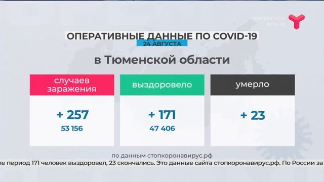 257 случаев за сутки в Тюменской области. Это данные по заболевшим новой коронавирусной инфекцией. За тот же период 171 человек выздоровел, 23 скончались. Это данные сайта стопкоронавирус.рф. http://www.youtube.com/user/TyumenTime?sub_confirmation=1