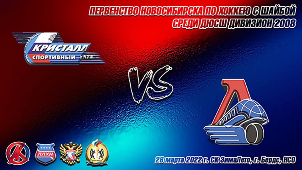 26 марта 2022 г. Открытое первенство Новосибирска по хоккею среди ДЮСШ. Дивизион 2008. Встреча команд Кристалл 08 (Бердск) и Локомотив 08 (Новосибирск). СК ЗимаЛето, г. Бердск.