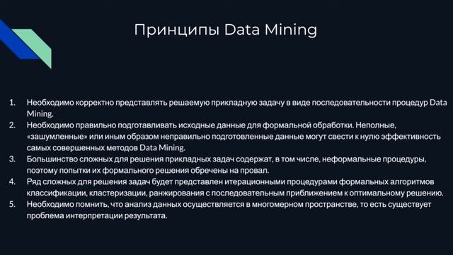 В этом видео перечислены методы, способные решать задачи, традиционно относящиеся к Data Mining. Отмечен мультидисциплинарный характер Data Mining. Кратко охарактеризованы основные принципы, учёт которых чрезвычайно важен при использовании методов Data Mining. Приведены сравнительные характеристики методов Data Mining. Презентация и видео подготовлены: Данил Перевощиков. Видео также опубликовано на Яндекс.Дзен канале "Самостоятельная работа": https://zen.yandex.ru/independent_work/