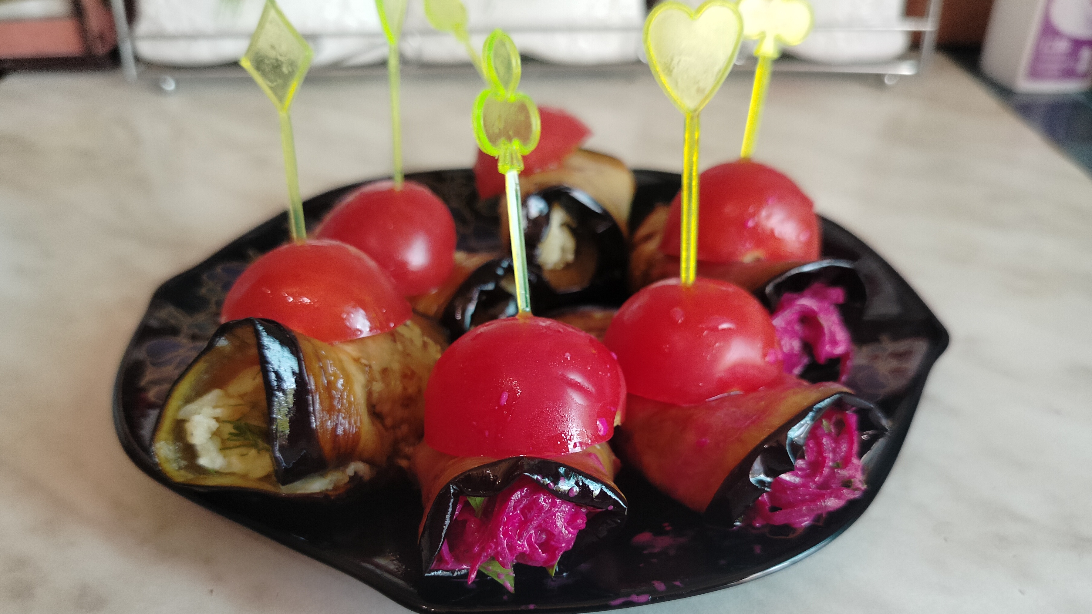 Закуска сытная, рулетики из баклажан с необычными начинками