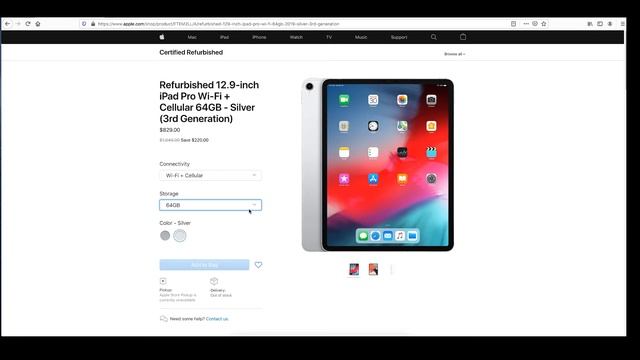 Apple.com has 64GB Apple iPad Pro 12.9" WiFi Tablet (Refurbished, Gen 3, Silver) for $699. Shipping is free. Specs 12.9" 2732x2048 Retina Display Apple A12X 64-Bit SoC Octa-Core Processor + M12 Coprocessor 64GB Internal Storage 12MP rear-facing camera / 7MP front-facing camera WiFi 5 802.11ac + Bluetooth 5.0 USB-C Connector Lithium-Polymer Battery (Up to 10 Hours per charge) Facial Recognition (Face ID) https://www.apple.com/shop/product/FTEM2LL/A/refurbished-129-inch-ipad-pro-wi-fi-64gb-2019-silver-3rd-generation
