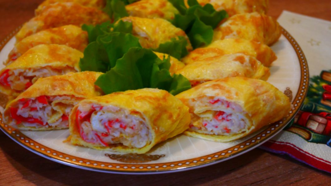 Закуска за 5 минут Рулетики с сыром и крабовыми палочками 3 яйца соль, перец начинка: 100 гр крабовых палочек 100 гр сыра 1 зубок чеснока 2 ст.л. майонеза