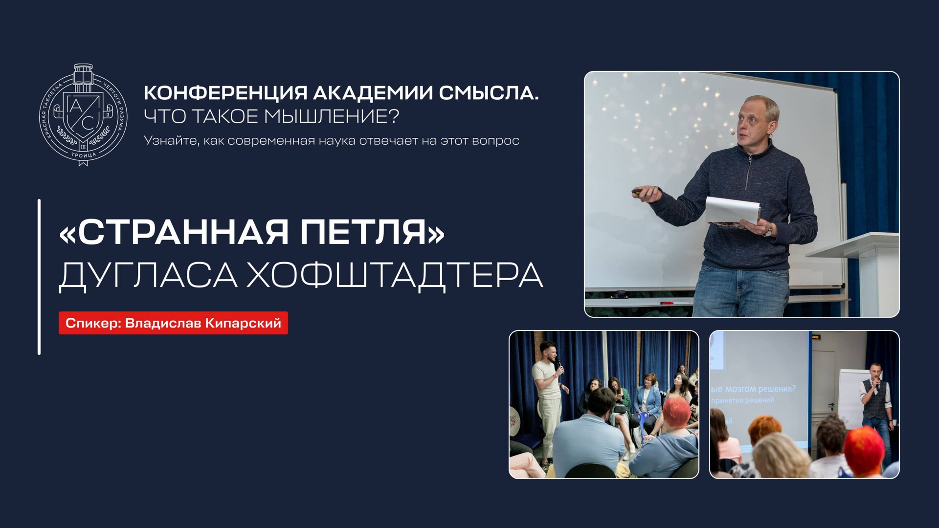 КОНФЕРЕНЦИЯ АКАДЕМИИ СМЫСЛА «Что такое мышление?» — это масштабное мероприятие, цель которого понять, в чём суть нашего мышления, как его в себе развивать. Все мы думаем — кто-то лучше, кто-то хуже, но и животные «думают», и искусственный интеллект тоже «думает». А в чём особенность нашего — человеческого — мышления? В чём его красота и эффективность? Почему именно оно даёт нам ощущение ценности и смысла собственной жизни? Над этим вопросом не одно тысячелетие бились лучшие умы человечества, мы же имеем уникальную возможность увидеть этот главный вопрос философии через призму современной нейронауки. Сегодня мы публикуем запись третьего доклада конференции. Тема: «Странная петля» Дугласа Хофштадтера Спикер: Владислав Кипарский, выпускник Академии смысла.