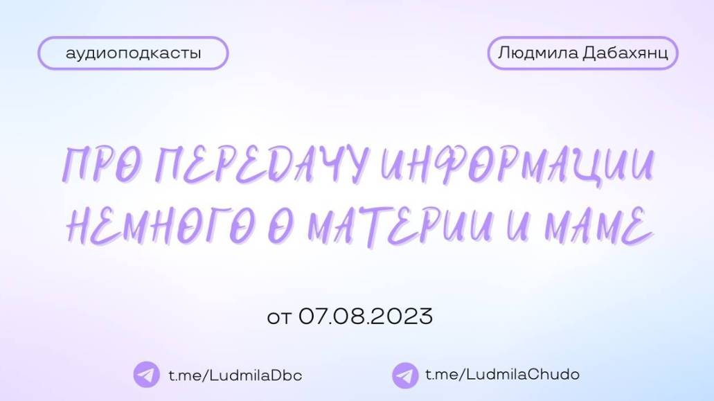 Аудиоподкаст от 07.08.23 На тему «Про передачу информации. Немного о материи и маме» ТЫ МОЖЕШЬ ПРИЙТИ СО СВОИМ ЗАПРОСОМ! ✓ Обязательно поставь лайк ✓ Подпишись на канал ✓ И поделись с близкими Это будет вашим балансом за движение и получение энергии. Если есть желание создать баланс брать-давать... приму от всего сердца с благословением (донейшн). С Огромной Любовью, Дабахянц Людмила ✨ Telegram: https://t.me/ludmiladbc ✨ Канал в telegram “Я ЕСТЬ ТО, ЧТО Я ЕСТЬ”: https://t.me/LudmilaChudo ✨Онлайн-школа: https://ludmilachudo.skillspace.ru/school