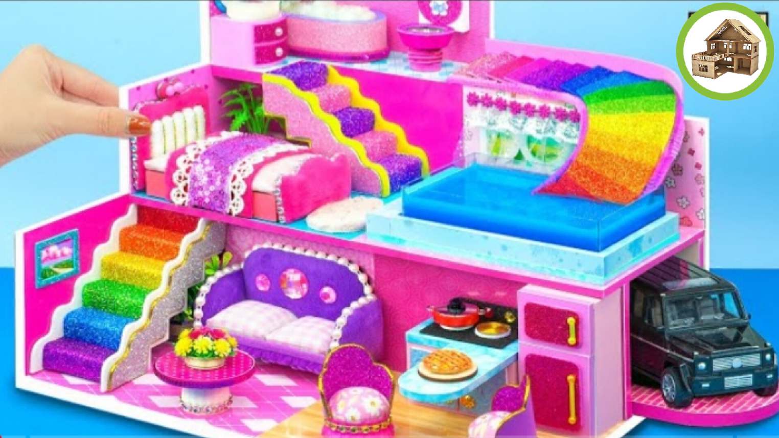 Красивый розовый 3-этажный дом с горкой и летающей водной горкой к бассейну из картона /158