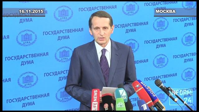 В субботу, 14 ноября, от имени депутатов Государственной Думы были направлены телеграммы с соболезнованиями Председателю Национального собранию Франции, Председателю Сената Франции и спикеру ливанского парламента, сообщил Сергей Нарышкин после заседания Совета Думы. В ходе брифинга спикер Госдумы также рассказал журналистам о ключевых законопроектах текущей пленарной недели.