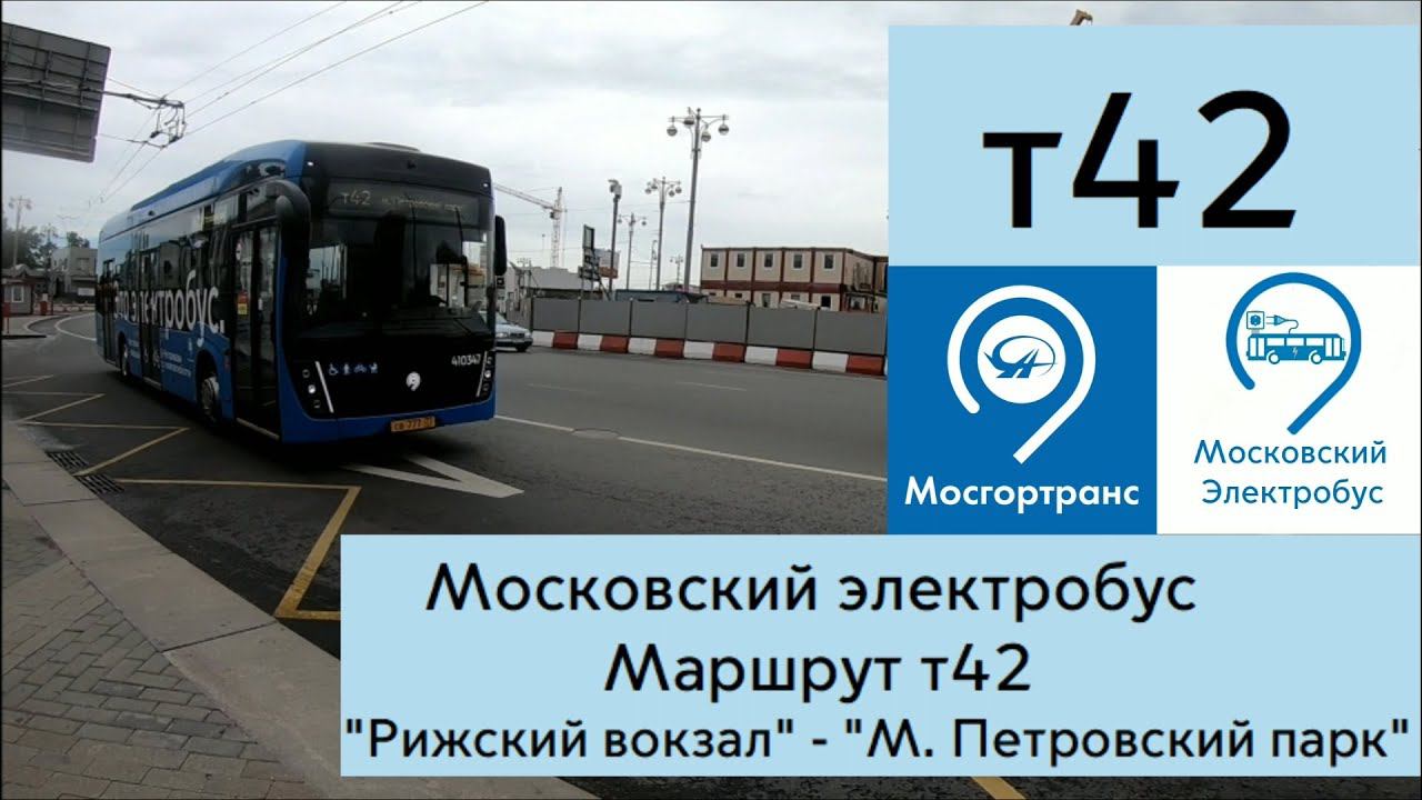 7-я полная поездка на Московском электробусе. 11-й маршрут в алфавитном порядке Т42 и 8-й по хронологии. Электробус КАМАЗ 6282 410347 Поездка в прямом направлении: Рижский вокзал Улица Сущевский вал Олимпийский проспект Станция метро "Марьина роща 1" Станция метро "Марьина роща 2" Улица Образцова Новосущевская улица, Социальный центр Мебельная фабрика Вятская улица, Станция метро "Савёловская" Кинотеатр "Прага" Петровско-Разумовский проезд Улица Верхняя Масловка Улица Верхняя Масловка д. 15 Петровско-Разумовская аллея Станция метро "Петровский парк"