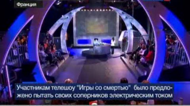 Французский тест на жестокость: людей пытали током в прямом эфире17 марта 2010 г. 16:19Францию шокировали "Игры со смертью" - реалити-шоу, где участникам предлагалось пытать людей электричеством. Игроки по очереди задавали вопросы человеку, привязанному к креслу, а за каждый неправильный ответ должны были, нажав на кнопку, ударять его током (разряды - до 380 вольт).