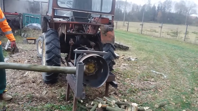 Поляки приспособили трактор для резки дров.