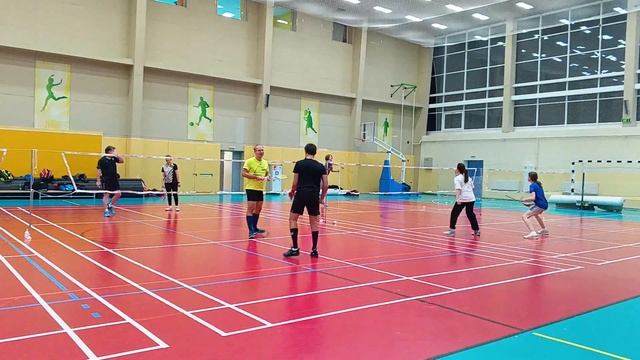Тренировочная игра в бадминтон через сетку. Играют любители, новички и опытные бадминтонисты. Игра на сборах в доме отдыха Снегири от клуба Искра 6-8 декабря 2024 #badminton #badmintonlovers #badmintonrussia #бадминтон #искра #iskra #snegiri #снегири