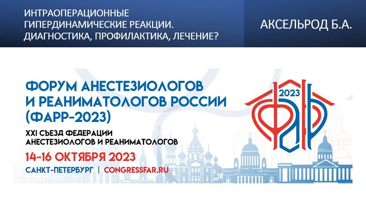 Видеозапись ФАРР-2023, XXI съезд Федерации анестезиологов и реаниматологов 14-16 октября 2023, Санкт-Петербург. Борис Альбертович Аксельрод "Интраоперационные гипердинамические реакции. Диагностика, профилактика, лечение?"