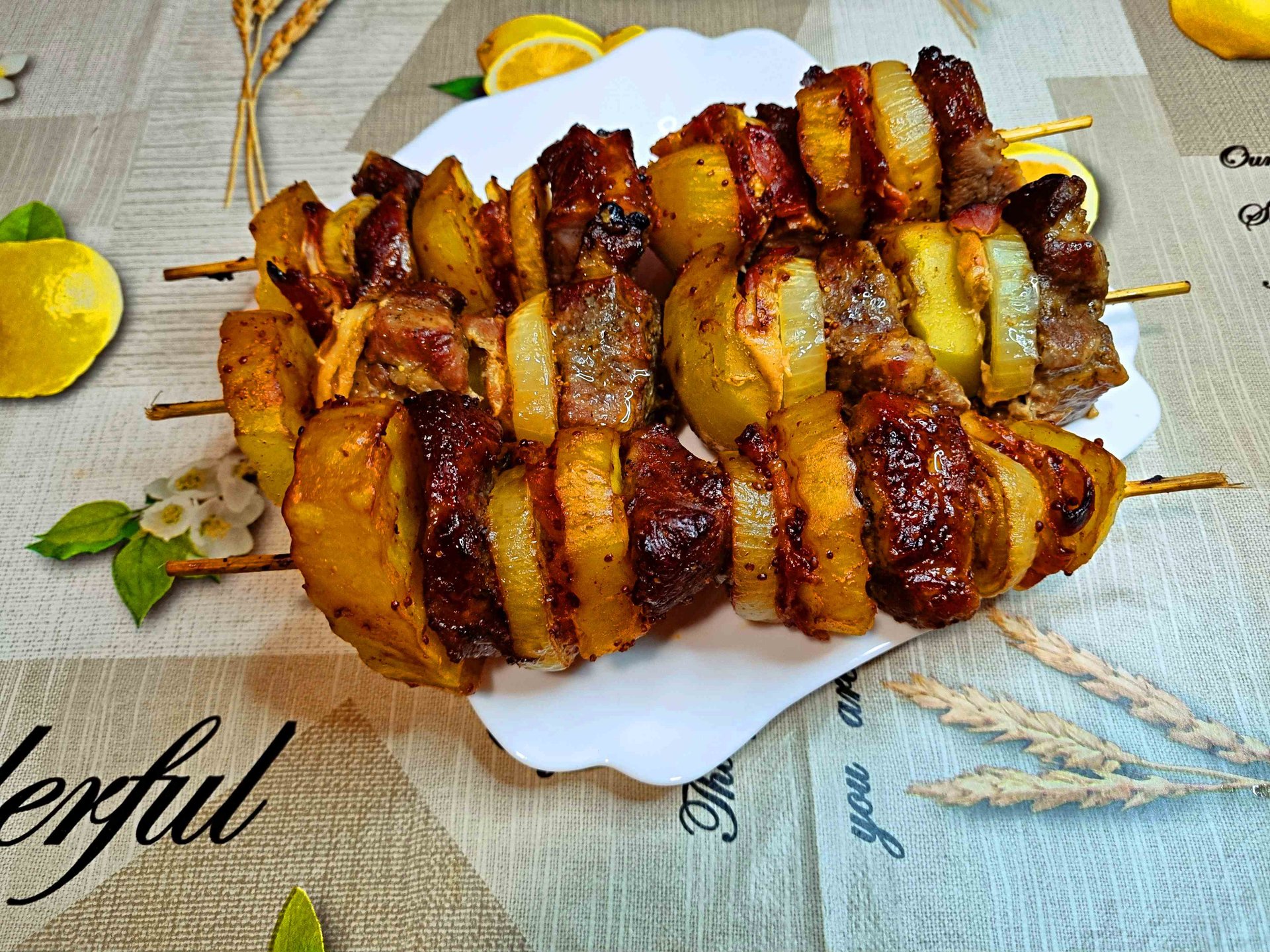 ПОЧЕМУ Я НЕ ГОТОВИЛА ЭТО РАНЬШЕ??? ОЧЕНЬ ВКУСНОЕ БЛЮДО КАК НА ПРАЗДНИК, ТАК И НА УЖИН. Потребуется : Свинина 1 кг. Режу на кусочки (толщиной 1 см). Я накрываю мясо пищевой пленкой и с помощью кухонного молотка сбиваю его с обеих сторон. Солим и перчим с обеих сторон по вкусу. Нарежьте 4 картофелины ломтиками. соль 1 ч. л. Черный молотый перец 0,5 ч. л. Паприка 0,5 ч. л. растительное масло 2 ст. л. Хорошо перемешать. Лук репчатый 2 шт. Режу лук кольцами. На шпажки поочередно насадить картофель, мясо, лук, бекон. Поверх фольги я положила влажную пергаментную бумагу. Выкладываю мясо на фольгу и плотно ее запечатываю. соевый соус 2 ст. л. кетчуп 1 ст. л. мед 1 ч. л. Французская горчица 1 ч. л. Хорошо перемешать. Мясо смазываю соусом. Ставлю мясо в духовку еще на 20 - 30 минут (до румяной корочки). Вынимаю мясо из духовки. Все готово! Приятного аппетита! Хорошего дня и хорошего настроения!