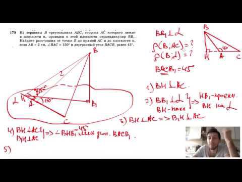 №170. Из вершины В треугольника ABC, сторона АС которого лежит в плоскости а, проведен к этой плоскости перпендикуляр BB1. Найдите расстояния от точки В до прямой АС и до плоскости α, если АВ = 2 см, ∠ВАС= 150° и двугранный угол ВАСВ1 равен 45°. Поддержать канал рублём - 5469400944002125 (Сбербанк) Мой второй канал для подготовки к ЕГЭ и ОГЭ - https://www.youtube.com/ЕвгенийСумин Инстаграм - https://www.instagram.com/EGE_OGE.math Личный инстаграм - https://www.instagram.com/ee_sumin VK - https://vk.com/evgeniysumin FB - https://www.facebook.com/EvgeniySumin