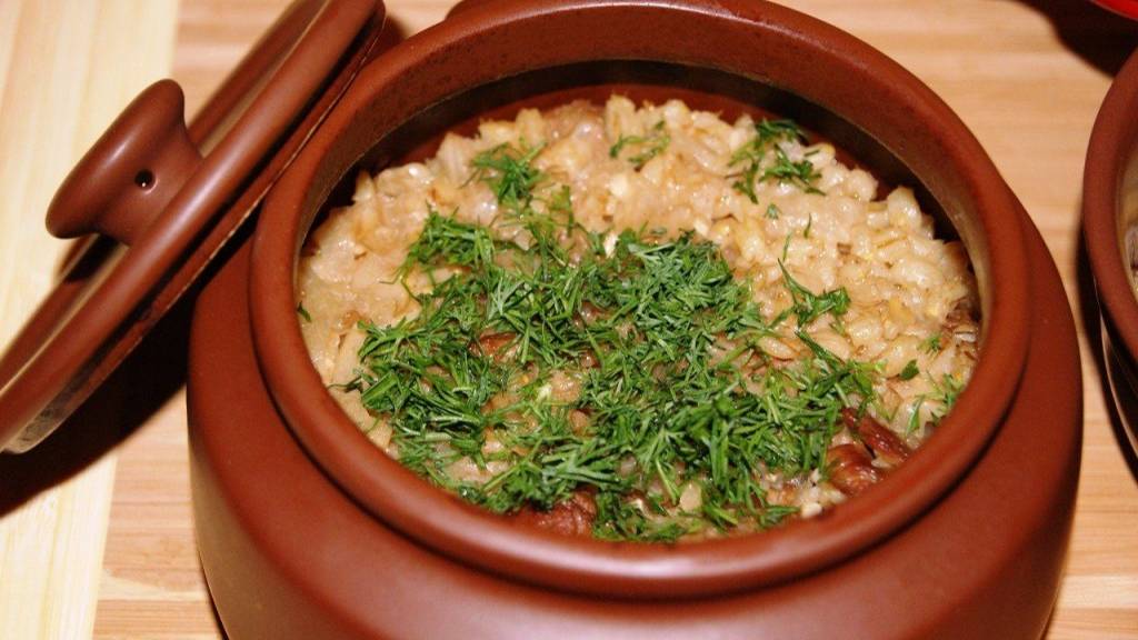 Перловка с мясом и грибами в горшочке