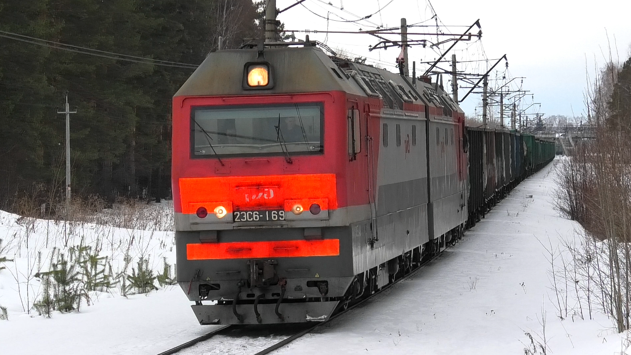Электровоз 2ЭС6-169 "Синара" с грузовым поездом следует по перегону Путевка - Лечебный. Свердловская ЖД. Свердловская область, Россия. Приписка: ТЧЭ-12 Тайга. 04.03.2023