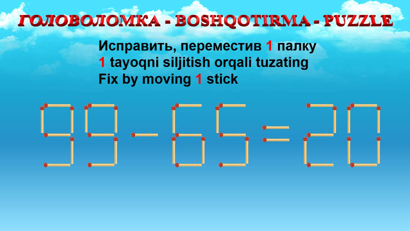 ГОЛОВОЛОМКА - BOSHQOTIRMA – PUZZLE. Спичка. 90-62=38, 95-30=68, 93-39=56, 99-68=20
