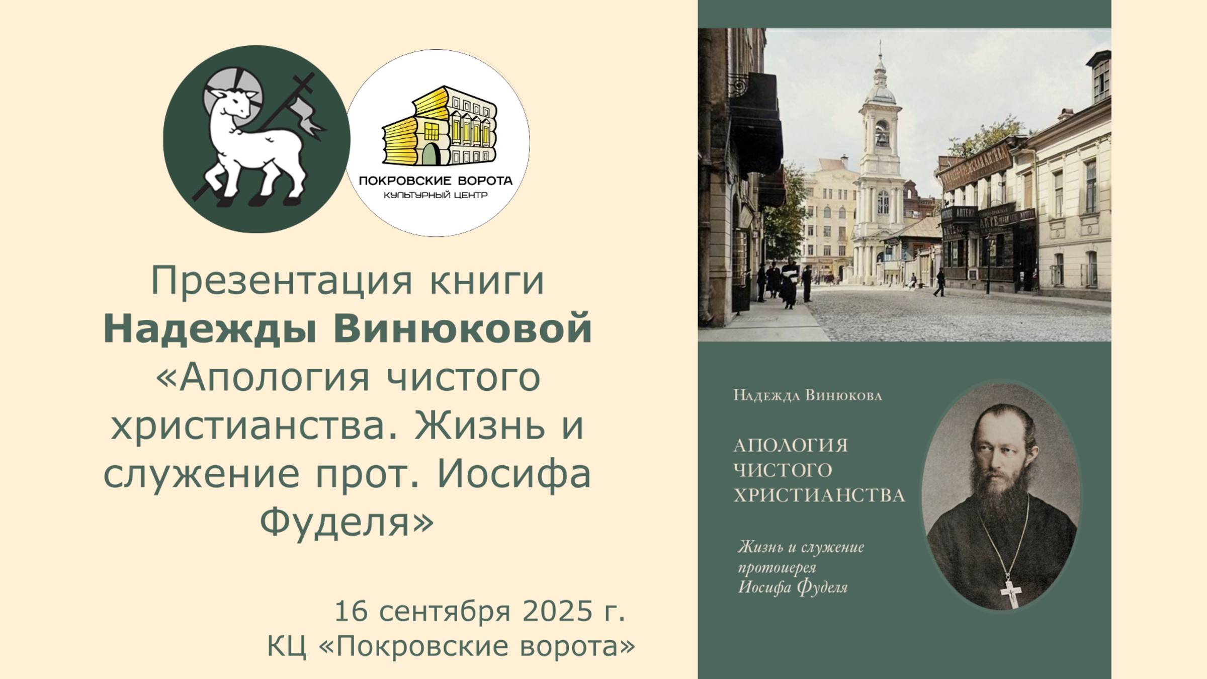 Презентация книги Надежды Винюковой о протоиерее Иосифе Фуделе «Апология чистого христианства» в КЦ «Покровские ворота» 16 сентября 2025 года. В вечере приняли участие телеведущий Феликс Разумовский, правнучка отца Иосифа Мария Астахова, теологи Вячеслав Ячменик и Кирилл Алексин. Книга стала лауреатом Макарьевской премии (2025)