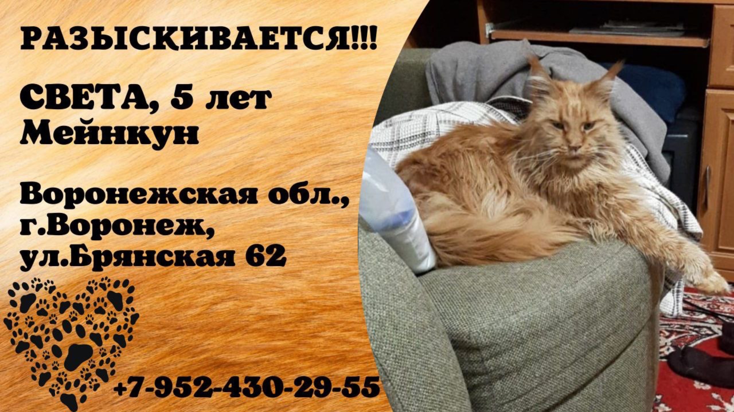 Воронежская Воронеж Пропала кошка 13.06.2025г по ул. Брянская д. 62 пропала кошка Света, породы Мейнкун, рыжего окраса. Кошка не контактная, к детям и другим животным агрессивна.На данный момент проходит курс лечения антибиотиками. Прошу сообщить любую информацию о ее местоположении по тел. Имя хозяина: Наталья Телефон: 79524302955 Адрес: Брянская улица, 62, Воронеж Инфо https://vk.com/wall-198815410_197584 #пропала_кошка#воронежская#воронеж