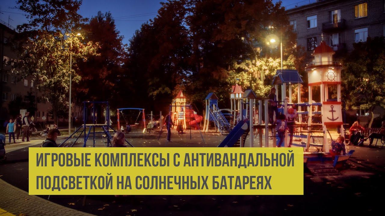 Игровые комплексы, скамейки, велопарковки с вечерней подсветкой на солнечных батареях