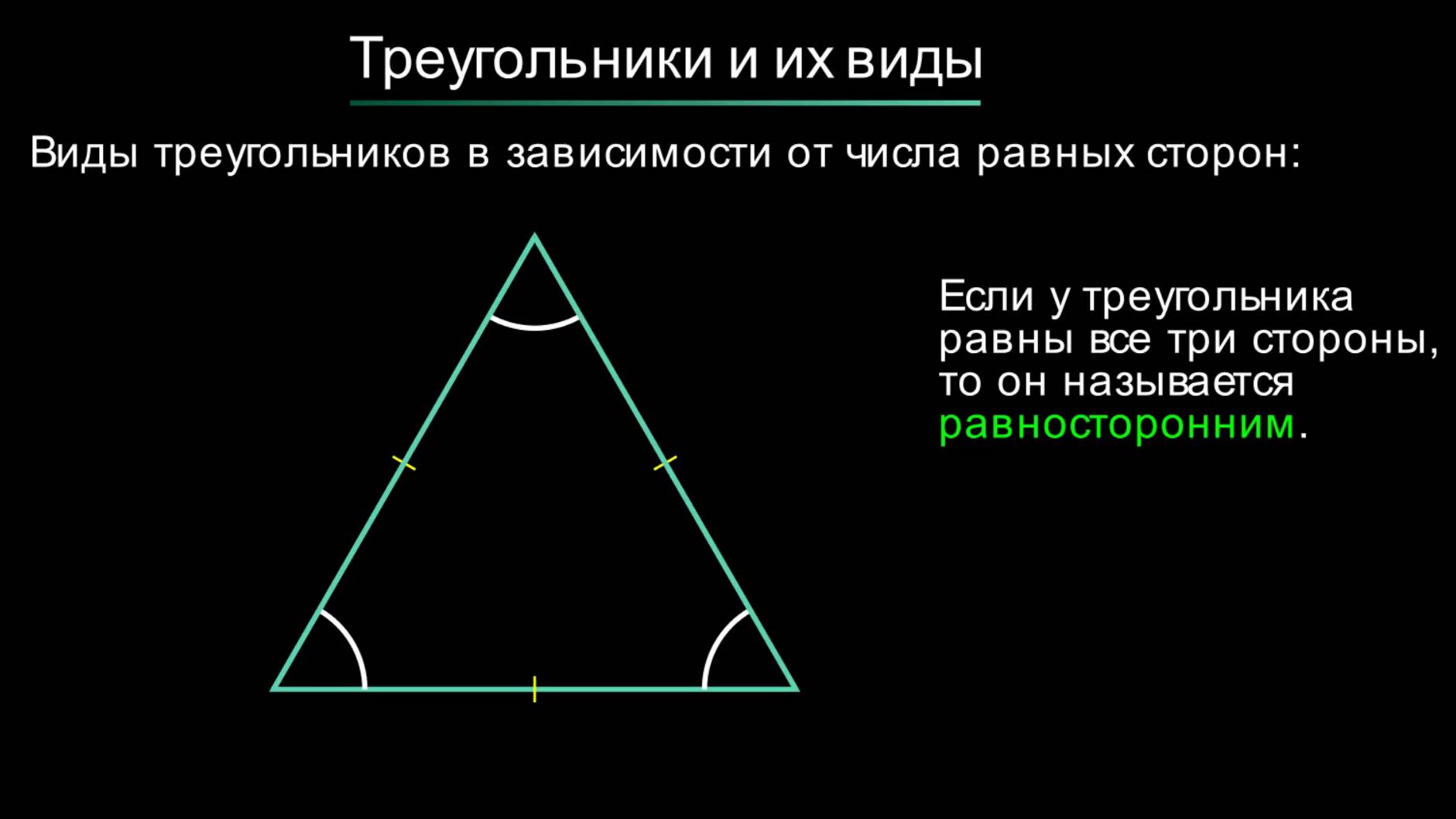 Математика. Геометрия 7 класс. Треугольник, их виды. Определение треугольника. Виды треугольников в зависимости от числа равных сторон: разносторонний, равнобедренный, равносторонний. Виды треугольников в зависимости от величины углов: остроугольный, прямоугольный, тупоугольный. Периметр треугольника. Равные треугольники. Свойство равных треугольников.