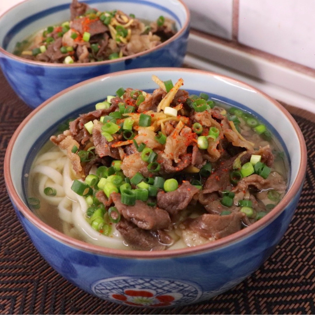 Ингредиенты: (2 порции) Удон (сухой) - 200 г. Говядина - 170 -180 г. Вода - 500 мл. Рыбный бульон Даши - 1 пакетик. Соевый соус - 2 ст.л. Саке/рисовое вино - 2 ст.л. Мирин - 2 ст.л. Вода - 50 мл. Сахар - 2 ч.л. Имбирь - 10 г. Устричный соус - 2 ч.л. Кунжутное масло - 1 ч.л. Зеленый лук, красный перец - по вкусу.