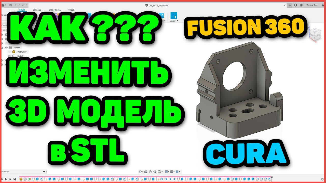 Все о 3д печати и 3д моделировании: https://www.youtube.com/channel/UCzI016x7MItBtQCJiSWI7yA/playlists?view=50&sort=dd&shelf_id=3&view_as=subscriber Экономь на покупках до 90%: http://got.by/46pyod В описании есть подробности НА ЧЕМ ТЫ ПЕЧАТАЕШЬ: UNI v2.2: https://uni-3d.ru/ Самосбор: https://youtu.be/8u7nvzzTTMY Longer LK4: http://got.by/50m0hy Дельта FLSUN Q5: http://got.by/514ta1 Фотополимерник Shasow 5.5S: http://got.by/514tp7 https://youtu.be/3ZsTXqJJlbA ХАЛЯВА ПРОМОКОД от FILAMENTARNO (скидка 5% на всю продукцию): HRTV4KHR Сайт https://filamentarno.ru/ Сборка 3д принтеров, обсуждение: https://vk.com/topic-103104105_40658426 На чем собирается UNI 3D и какова его стоимость: https://vk.com/page-103104105_56477136 Всем привет! В процессе сборки 3д принтера UNI не обошлось без 3д моделирования и в том числе изменения готовых 3д моделей. В данном видео решил показать вам как это делаю я. Изменить детали STL можно. И даже в программе слайсере, например CURA. А так же коснемся изменения деталей в программе Fusion 360. По сути конечно больше это будет новое 3д моделирование детали с помощью старой детали в stl. Друзья! Я искренне благодарю вас за ваши комментарии, лайки и поддержку! Спасибо что подписываетесь и остаетесь со мной! ================================== Связаться с технарем можно следующими способами: Канал в телеграм: https://t.me/technarr Группа ВК: https://vk.com/technarrus Группа в Facebook: https://goo.gl/Ds8Zsp Instagram: https://www.instagram.com/technarrus/ Моя страничка в THINGIVERSE: https://www.thingiverse.com/Vital81/designs Поддержать технаря копеечкой можно здесь: https://www.donationalerts.com/r/technarrus или Yandexmoney: 41001171922875 ================================== #3дмоделирование #3дпечать #fusion360 #cura