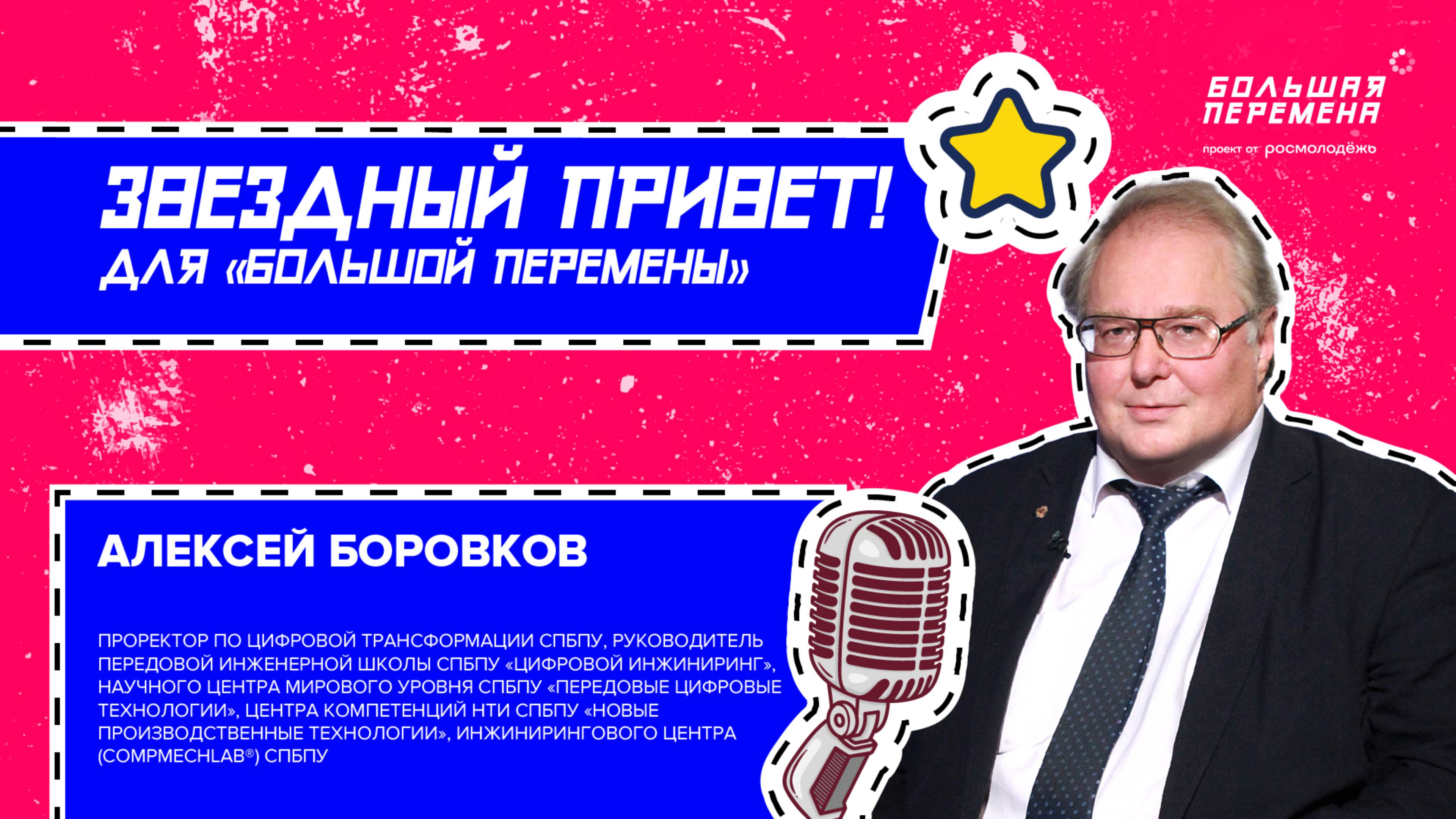 💥Новый звёздный привет летит на «Большую перемену» из Санкт-Петербургского политехнического университета. 🎬Проректор по цифровой трансформации СПбПУ, руководитель Передовой инженерной школы СПбПУ «Цифровой инжиниринг», научного центра мирового уровня СПбПУ «Передовые цифровые технологии», Центра компетенций НТИ СПбПУ «Новые производственные технологии», Инжинирингового центра (CompMechLab) СПбПУ Алексей Боровков расскажет о своём пути в науку, выборе вуза, факультета и кафедры и о том, чем он занимается сейчас. А ещё ты узнаешь, что такое «интеллектуально-инженерный спецназ»! Надеемся, это видео поможет и тебе сделать правильный выбор! #БольшаяПеремена #ЗвёздныйПривет #МесяцАтома