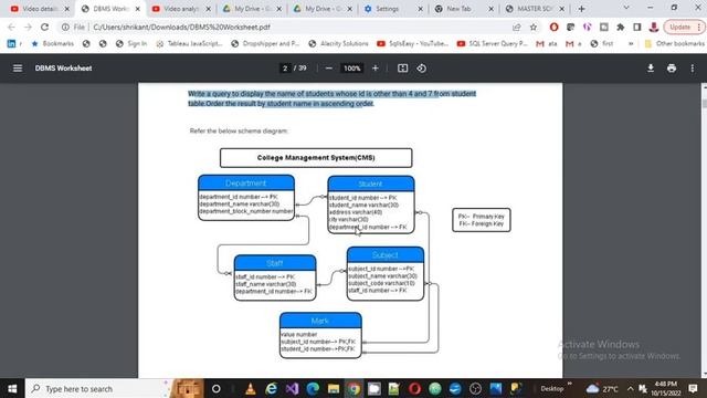 1.Write a query to display the name of students whose id is other than 4 and 7 from student table.Order the result by student name in ascending order. drop table Student create table Student ( Student_Id int primary key , Student_Name varchar(30) , Address varchar(40) , City varchar(30) , Age int , Department_id int foreign Key references Department (Department_id) ) insert into Student select 1,'A','USA','A',10,1 union select 2,'A','USA','A',10,2 ---1.display the name of students --2.Student id other than 4 and 7 --3.by ascending order (student name) select Student_Name from Student where Student_Id not in (4,7) order by Student_Name asc