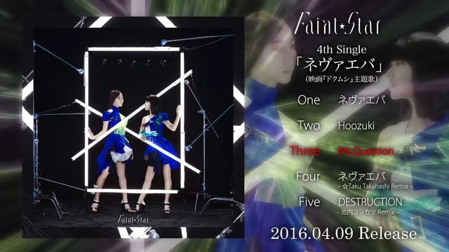 Faint⋆Star 4th Single「ネヴァエバ」全曲ダイジェスト 全曲Lyricsはこちらのサイトから → COMING SOON !! http://www.faintstar-tokyo.jp/mag/lyrics 2016年4月9日(土)発売 FST-007/¥1,500(tax in) Produced by 玉井健二 & agehasprings Directed & Organized by 森岡英貴(agehasprings) Vocal Contracted by 市川洋介(agehasprings) Mastered by 茅根裕司(Sony Music Studios Tokyo) M1. ネヴァエバ(映画『ドクムシ』主題歌) 作詞:濱名琴, U-ka  作曲:KOMODA, 玉井健二  編曲:飛内将大, 玉井健二 Programming & All instruments:飛内将大(agehasprings) Recorded by米津裕二郎(prime sound studio form), 森真樹(agehasprings) Mixed by 中村’NK-1’研一 Recorded at Studio Device Mixed at Tune Studio M2. Hoozuki 作詞:池橋壮一 作曲:池橋壮一 編曲:玉井健二, Integral Clover Programming & All instruments:Integral Clover(agehasprings) Recorded by 森真樹(agehasprings) Mixed by 熊坂敏(prime sound studio form) Recorded at Studio Device Mixed at prime sound studio form M3. Ms.Question 作詞:松野恭平 作曲:orange spotting 編曲:orange spotting, 玉井健二 Programming & All instruments:orange spotting(onetrap) Recorded by 五味涼太(prime sound studio form), 米津裕二郎(prime sound studio form) Mixed by 熊坂敏(prime sound studio form) Recorded at Studio Device Mixed at prime sound studio form M4. ネヴァエバ - ☆Taku Takahashi Remix – 作詞:濱名琴, U-ka  作曲:KOMODA, 玉井健二 Remixed by ☆Taku Takahashi (m-flo, block.fm) Additional Production by Mitsunori Ikeda (Tachytelic Inc) Mixed by 関根青磁 Mixed at The Hit Studio ☆Taku Takahashi by the courtesy of rhythm zone / AVEX MUSIC CREATIVE INC. M5. DESTRUCTION - 池内ヨシカツ Remix – 作詞:Agree2  作曲:春尾ヨシダ Remix and Additional Production by 池内ヨシカツ Mixed by 池内ヨシカツ