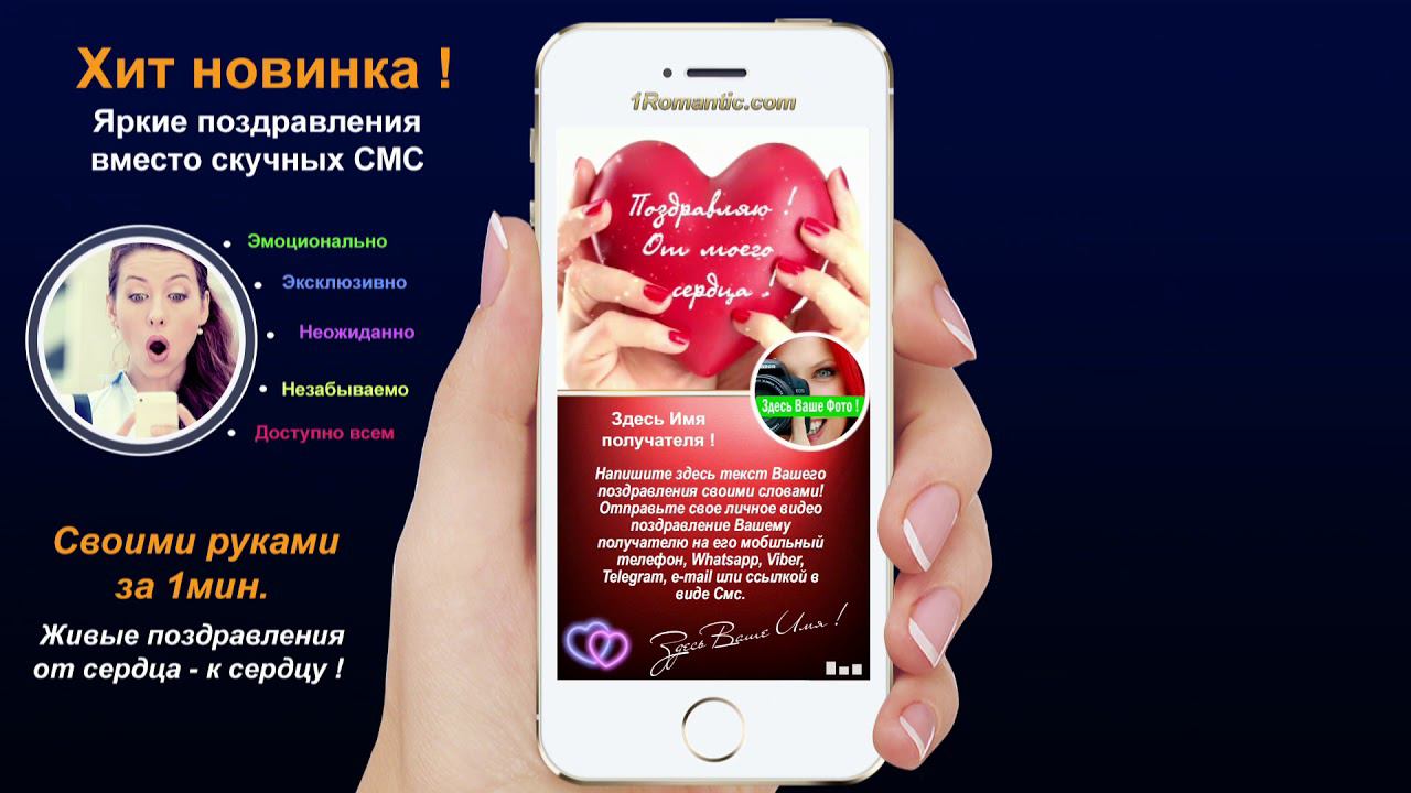 ЗАПОЛНИТЬ ЭТУ ОТКРЫТКУ СЕЙЧАС: https://1romantic.com/musicalnye-pozdravleniya/serdechko-moe/ Дорогие друзья! Вам остаётся только, написать нужный вам текст и загрузить свою фотографию. 1Romantic.com Является первым и единственным в мире сервисом интерактивных видео поздравлений. Мы используем собственную уникальную технологию, добавляя ежедневно самые новые и последние разработки программирования. У нас Вы можете найти поздравления на любой вкус, только высокого качества и разрешения. Согласитесь, всегда приятней, отправить поздравления от себя лично, чем пересылать чужие, с уже заготовленным стандартным и быстро мерцающим текстом, как рекламный баннер, пересылаемый друг-другу от тысячи к тысячам где нет Ваших Имён. Задумайтесь ! Это выглядит слишком наивно и как минимум глупо, особенно для людей которые умеют писать и читать (на мою розочку сверкалку или стикер и отвали). Теперь всё будет иначе ! Вы можете сами передать своё настроение, тем людям, которым Вы будете адресовать своё поздравление. Теперь Вы сами, творец, художник и поэт своих чувств, наполняя видео открытку своими словами, излучая только самое доброе, искреннее из своих тёплых сердец. Загрузить свою любимую фотографию или фотографию получателя, что безусловно, будет гораздо приятней и неожиданней для него) Безусловно, мы подумали и о музыкальном оформление. Наверняка, Вы будете подбирать нужные слова и фотографию под ту песню, которую Вы захотите загрузить сами, а не ту которую Вам навязывают. Ну и самое главное, Вы можете использовать функцию добавления своего голоса, программа сама наложит Ваш голос на начало загруженной песни. Поверьте это очень оригинально, особенно если Ваш друг не слышал Вас долгие годы. Такое поздравление можно сделать действительно за 30-60 сек. Но если Вы творческий человек, оно не отпустит Вас так быстро))) И Вы будете думать, сочинять, плакать, улыбаться, восхищаться, раскрыв в себе новые таланты... возможно это станет Вашим первым собственноручным творением . Удачи Вам ! С уважением, Ваши Романтики ! Краткий список предлагаемых нами поздравлений... Поздравления с днем рождения женщине. Поздравления с днем рождения мужчине. Поздравления с днем рождения другу. Поздравления с днем рождения подруге. Поздравления с днем рождения для детей. Поздравления с днем святого Валентина. Поздравления Папе. Поздравления с днем рождения Маме. Прикольные поздравления. Видео поздравления с днем рождения. Музыкальные поздравления с днем рождения. Слайд-шоу с днем рождения. и многое-многое другое.