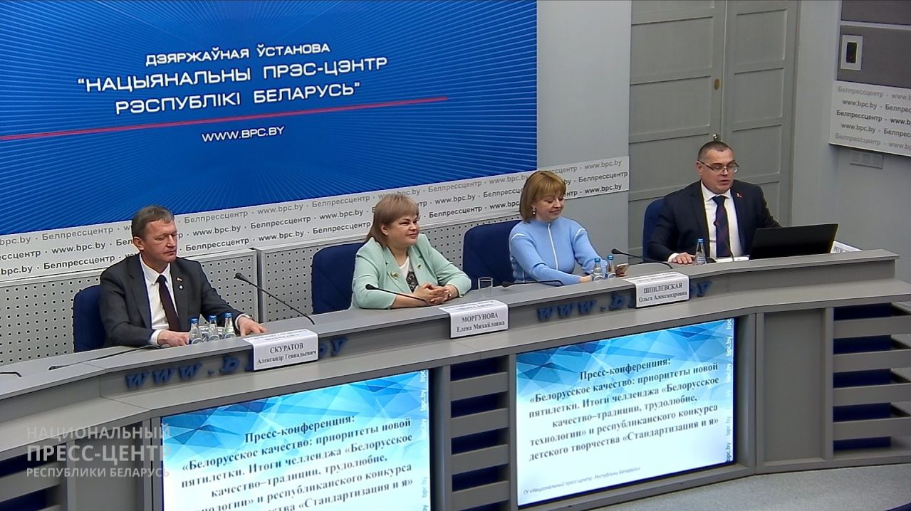 Пресс-конференция: «Белорусское качество: приоритеты новой пятилетки. Итоги челленджа «Белорусское качество–традиции, трудолюбие, технологии» и республиканского конкурса детского творчества «Стандартизация и я» Моргунова Елена Михайловна – председатель Государственного комитета по стандартизации Республики Беларусь; Скуратов Александр Геннадьевич – директор Белорусского государственного института стандартизации и сертификации (БелГИСС); Шпилевская Ольга Александровна – председатель Белорусского союза женщин, директор Национального филиала (Представительства) Межгосударственной телерадиокомпании «Мир» в Республике Беларусь