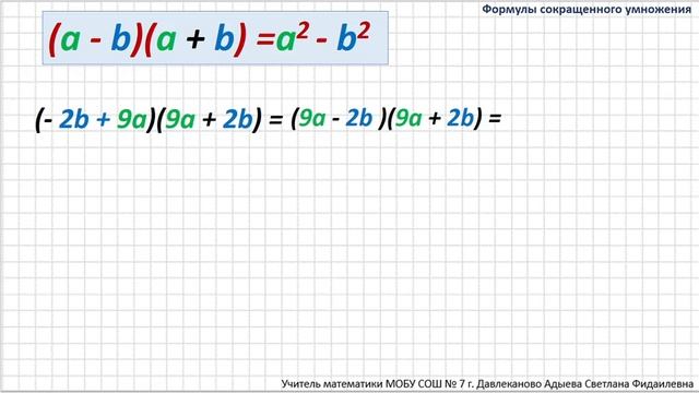 Произведение разности и суммы двух выражений, 7 класс