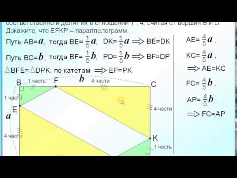В прямоугольнике АВСD проведены отрезки FE и KP так, что точки Е, F, K, P лежат на сторонах AB, BC, CD и DA соответственно и делят их в отношении 1 : 4, считая от вершин В и D. Докажите, что EFKP – параллелограмм.