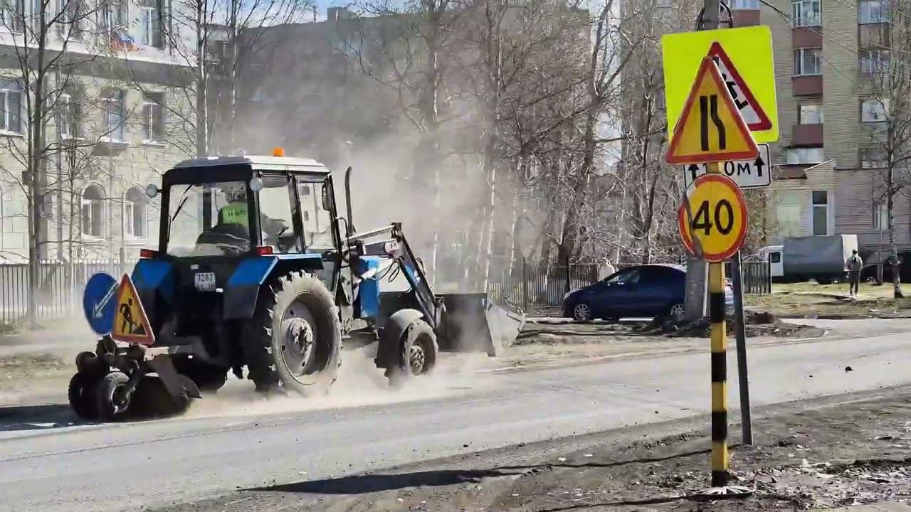 Зачем соблюдать правила благоустройства, если есть просто трактор с щёткой? Намочить- это никому не нужно, пусть дышать пылью и грязью эти людишки.