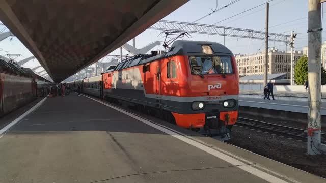 Электровоз ЭП2К-176 с поездом № 81 сообщением Санкт-Петербург — Белгород отправляется с 7-го пути станции Санкт-Петербург-Главный. На соседнем пути продолжается посадка на поезд № 35 сообщением Спанкт-Петербург – Адлер. #ржд #поезд #поезда #фпк #электровоз #эп2к #санктпетербург #питер