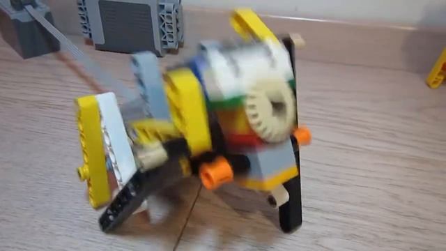 Еще одна модель шагающего робота, собранная на он-лайн занятии. Один из моих младших учеников назвал ее "кузнечиком". Что ж, пусть будет "кузнечик" /хотя, конечно, не прыгает.../. Система рычагов приводится в движение одним М-мотором, а в роли передаточного механизма выступает червячная передача.