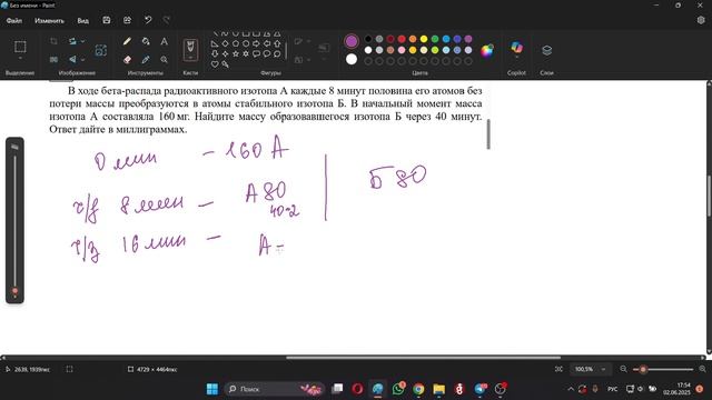 В ходе бета-распада радиоактивного изотопа А каждые 8 минут половина его атомов без потери массы преобразуются в атомы стабильного изотопа Б. В начальный момент масса изотопа А составляла 160 мг. Найдите массу образовавшегося изотопа Б через 40 минут. Ответ дайте в миллиграммах.