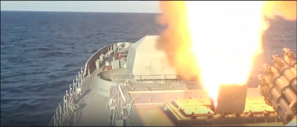 Запуск четырех крылатых ракет "Калибр" с фрегата Черноморского флота РФ.