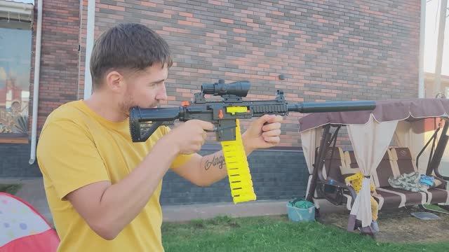 непрерывный режим стрельбы и одиночный выстрел Автоматический выброс гильз Соедините звенья патронной ленты, зарядите в нее пули и установите ленту в окно приемника Реалистичный внешний вид Патронная лента с цепным соединением Игра: 1. Выберите режим стрельбы: одиночный или очередью. Чтобы пулемет стрелял очередью, переведите специальный рычаг, расположенный с левой стороны корпуса игрушки, в положение «автомат». Нажмите на спусковой крючок и удерживайте его, пулемет начнет осуществлять выстрелы очередью. 2. Для того, чтобы пулемет перешел в режим одиночной стрельбы, переведите тот же рычаг, расположенный с левой стороны корпуса игрушки, в положение «одиночный». Затем переведите затвор, расположенный с правой стороны игрушки, и нажмите на спусковой крючок – пулемет начнет осуществлять одиночные выстрелы. 3. Чтобы выбрать режим «автоматический выброс гильз», переведите специальный рычаг, расположенный с правой стороны корпуса игрушки, в вертикальное положение. Для того, чтобы игрушечное оружие перестало автоматически выбрасывать гильзы, переведите рычаг в горизонтальное положение. Дальность выстрела до 10м Размер д/в:83х27см Всегда используйте защитные очки (входят в комплект) Аккумуляторный магазин Не требует перезарядки Непрерывная подача патронов Аккумулятор 7.4V/ 500mAh Li-ion Время подзарядки: 2.5 часа Время работы: 20 мин
