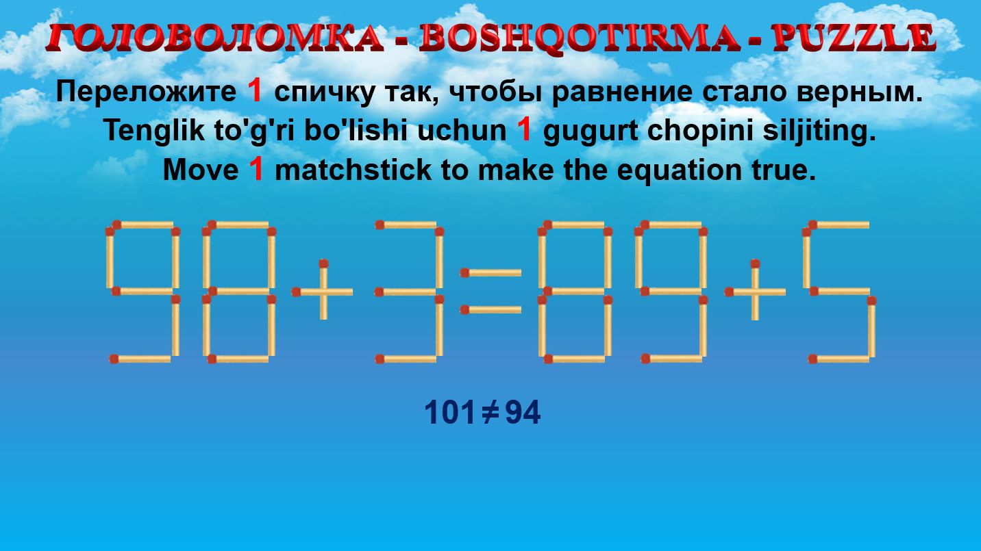 ГОЛОВОЛОМКА - BOSHQOTIRMA – PUZZLE. Спичка. 98+3=89+5, 93+2=98-5, 90+9=96+9, 84+8=95+3