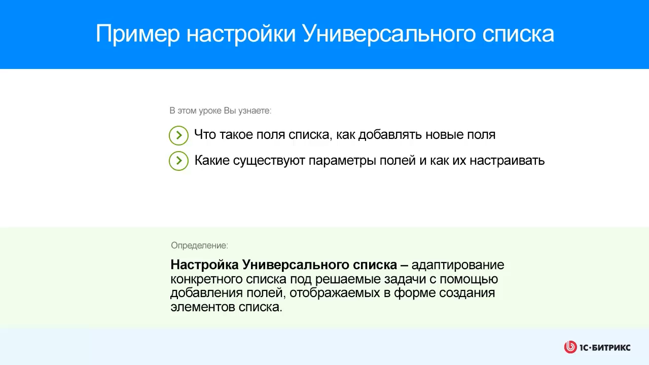 Пример настройки универсального списка: - Что такое поля списка, как добавлять новые поля - Какие существуют параметры полей и как их настраивать К уроку курса Контент-менеджер: https://dev.1c-bitrix.ru/learning/course/index.php?COURSE_ID=34&LESSON_ID=2956