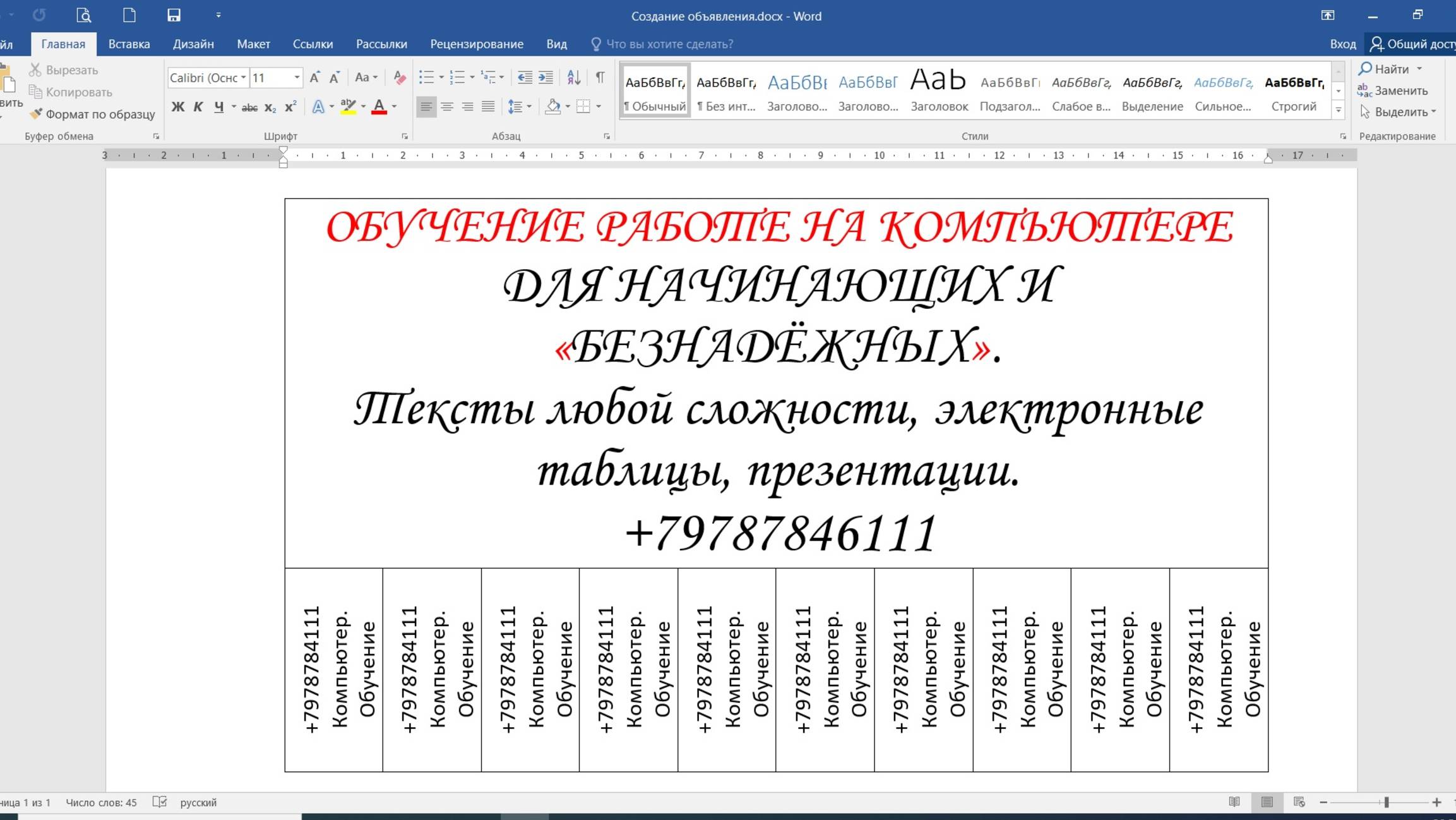 В этом видео представлен фрагмент урока, в котором очень подробно разобран процесс создания объявления в программе Microsoft Word.