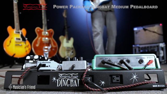 For more info: http://www.musiciansfriend.com/amplifiers-effects/voodoo-lab-dingbat-medium-pedalboard-power-package-with-pedal-power-2-plus This Voodoo Lab Power Package features a lightweight, aircraft-grade aluminum Dingbat Medium Pedalboard with a Pedal Power 2 Plus power supply. Combined, it gives you a tour-strength setup with enough power for eight standard 9-volt effects pedals. For added versatility, four of the eight power outputs can be switched to 12-volt operation for compatibility with ACA adapters. Two of the outputs deliver 250 milliamps for high-current effects. And the last two feature a switchable battery sag control from 4 volts to 9 volts. For pedals with higher-voltage needs, two power outputs can be tied together with an optional Voltage Doubling Cable, giving you the ability to run 18-volt and 24-volt effects without the need of an external adapter. The medium-sized board features a surface area of 22 by 13.5 inches— more than enough space for up to eight standard-size effects pedals. And, with the Pedal Power 2 Plus securely mounted on the bottom side of the board, the included hook-and-loop tape, cable ties and power cables work flawlessly with the Swiss-cheese-style design to ensure a clean, organized look. This American-made package also includes a heavy-duty gig bag with a premium YKK zipper, padded shoulder strap, padded carrying handle and stowable backpack straps for hands-free transportation between gigs. Get your hands — and your feet — on the Dingbat Medium with Pedal Power 2 Plus, and keep your pedals safe, organized and powered wherever you play. -------- Effects pedals seen in this video (in order of signal chain): 1. TC Electronic Polytune 3 Pedal Tuner // http://www.musiciansfriend.com/accessories/tc-electronic-polytune-3-pedal-tuner 2. Dunlop BG-95 Buddy Guy Wah Pedal // http://www.musiciansfriend.com/amplifiers-effects/dunlop-bg-95-buddy-guy-wah-pedal 3. Walrus Audio Deep Six Compressor // http://www.musiciansfriend.com/amplifiers-effects/walrus-audio-deep-six-compressor 4. Fulltone OCD Obsessive Compulsive Drive Overdrive // http://www.musiciansfriend.com/amplifiers-effects/fulltone-ocd-obsessive-compulsive-drive-overdrive-guitar-effects-pedal 5. Voodoo Lab Superfuzz Pedal // http://www.musiciansfriend.com/amplifiers-effects/voodoo-lab-superfuzz-pedal 6. MXR EVH Eddie Van Halen Phase 90 // http://www.musiciansfriend.com/amplifiers-effects/mxr-evh-eddie-van-halen-phase-90 7. Line 6 DL4 Delay Guitar Effects Pedal // http://www.musiciansfriend.com/amplifiers-effects/line-6-dl4-delay-guitar-effects-pedal 8. Electro-Harmonix Holy Grail Max // http://www.musiciansfriend.com/amplifiers-effects/electro-harmonix-holy-grail-max-guitar-effects-pedal Recorded at Musician’s Friend in August 2017.