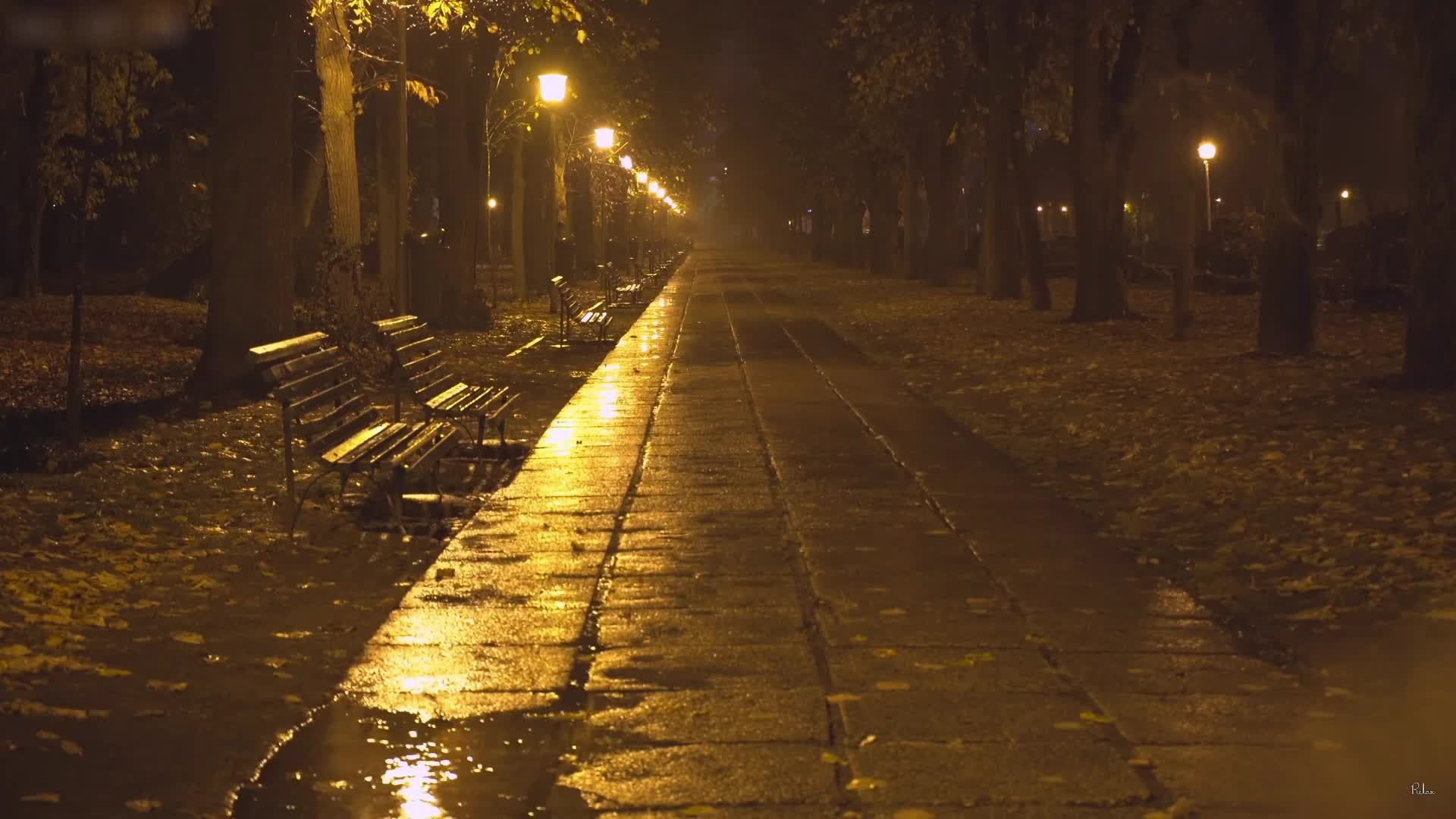 Тихая ночь в парке с расслабляющими звуками дождя, падающего на пустые улочки, лужи и листья