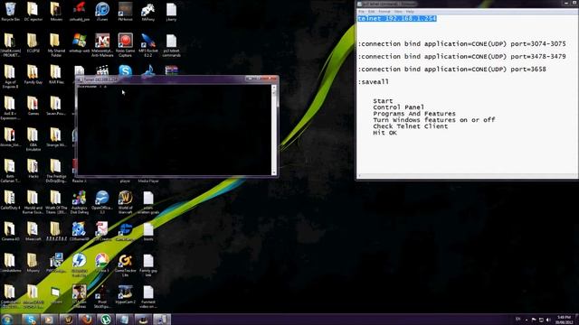 This is how to open on any router but the IP I use is only for Thompson routers. You can find out your own router's IP through Google. Step one is to show you how to be able to use Telnet because most windows 7 PC's have it disabled. For MAC users go here after video --- http://www.wikihow.com/Use-Telnet-on-Mac-OS-X Below are the steps to do it if the video is too fast or hard to follow Start Control Panel Programs And Features Turn Windows features on or off Check Telnet Client Hit OK It skips to step two where you type copy paste the following commands into the start search. telnet 192.168.1.254 ---------- Thompson router IP only ------- message me your router type and ill find out your router default IP or go to this link ---- http://www.routerpasswords.com/ ^^^^^^^^^^^^for router default user and pass^^^^^^^^^^^^^^^^^^^^^ ***A router IP is so your can get your configuration page it has nothing to do with your computer's IP*** The username: admin The password: "nothing" leave it blank. just press enter/return Then copy paste the following :connection bind application=CONE(UDP) port=3074-3075 :connection bind application=CONE(UDP) port=3478-3479 :connection bind application=CONE(UDP) port=3658 :saveall Start any Cod and start playing with an OPEN NAT!