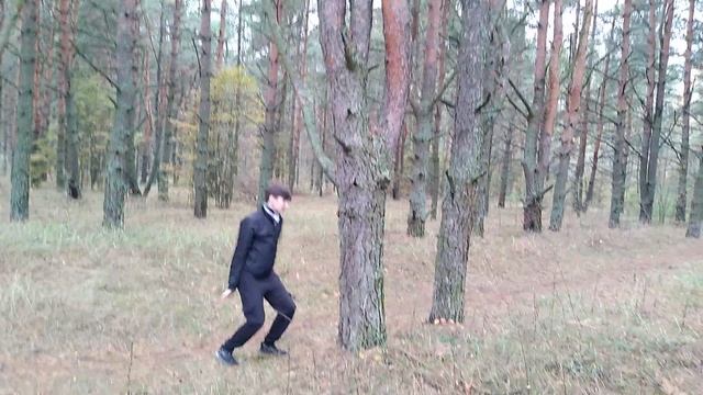 Залез на дерево в сосновом лесу