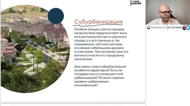 На уроке географии в онлайн-школе "Точка Знаний" речь зашла о таком явлении как субурбанизация. КС рассказал о том, что в современном мире многие успешные люди предпочитают селиться не в центрах крупных городах, где много шума, а в тихих пригородах.