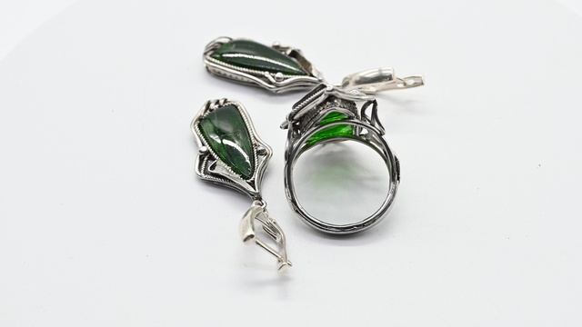•Авторское украшение ручной работы. Камни установлены в оправу из ювелирного сплава - нейзильбер. •Форма и рисунок камня никогда не повторяются, что делает данное изделие единственным в своем роде. •Габарит кольца 18*31мм, серьги: 15*30мм., вес 8,4 г •Швензы изготовлены из серебра проба отсутствует. •Указаны габариты серьги без швензы. •На поверхности камня допустимо присутствие естественных природных прожилок и микротрещин. •При заказе вы покупаете образец, который представлен на фото.