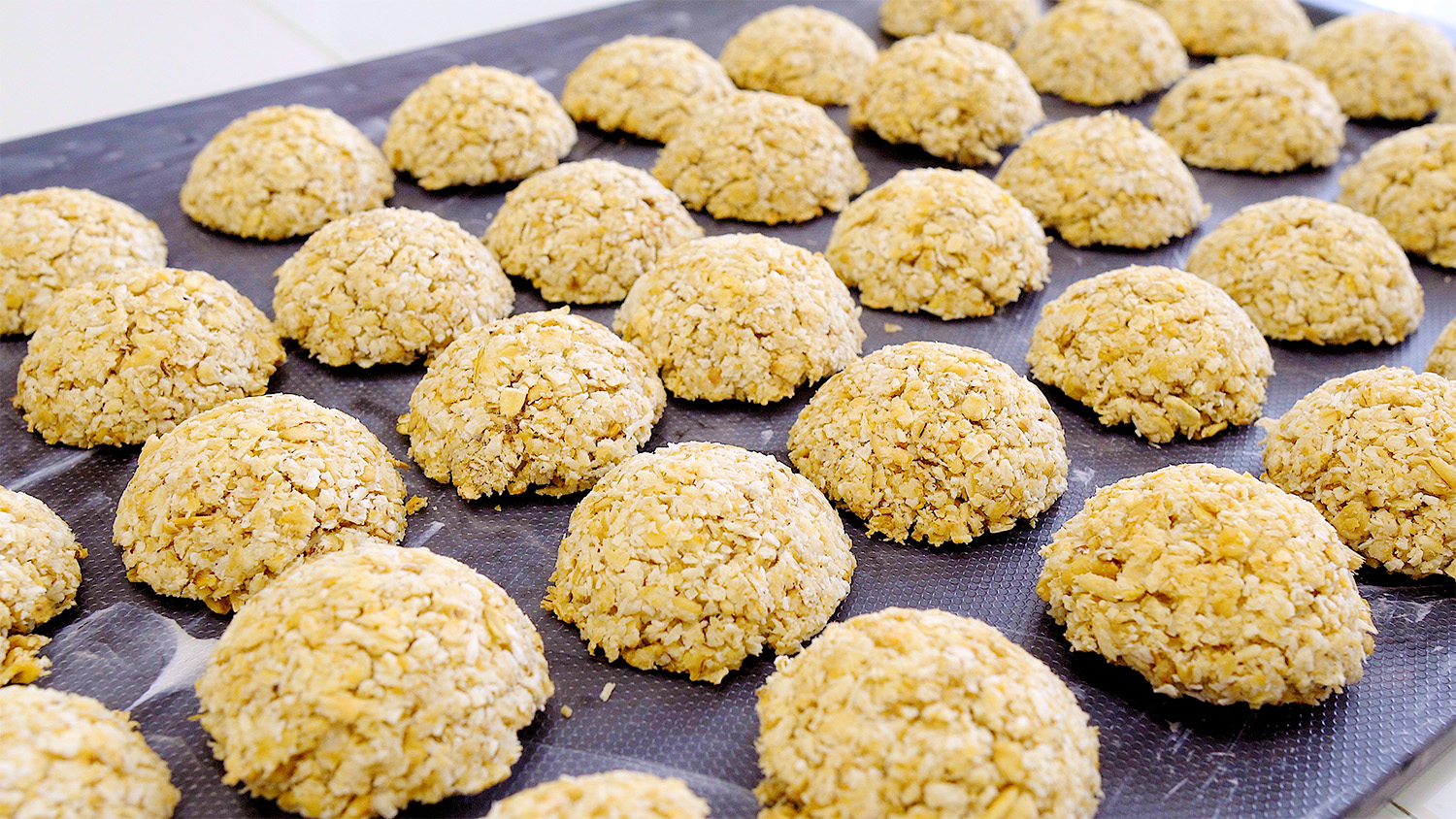 Овсянка (120 г). Кокосовая стружка (60 г). Ванилин (1/4 ч л) по желанию. Кокосовая стружка (60 г). Горячая вода (200 мл). Овсянка (60 г). Выпекать при температуре 180°C / 356°F 15 минут.